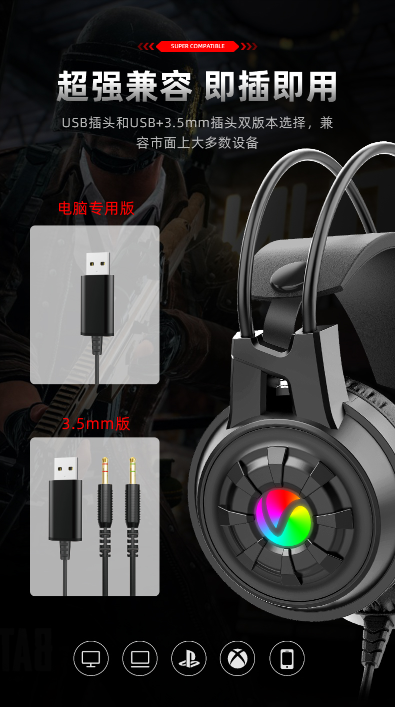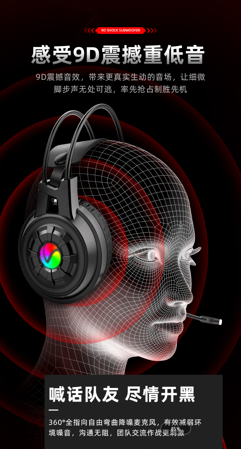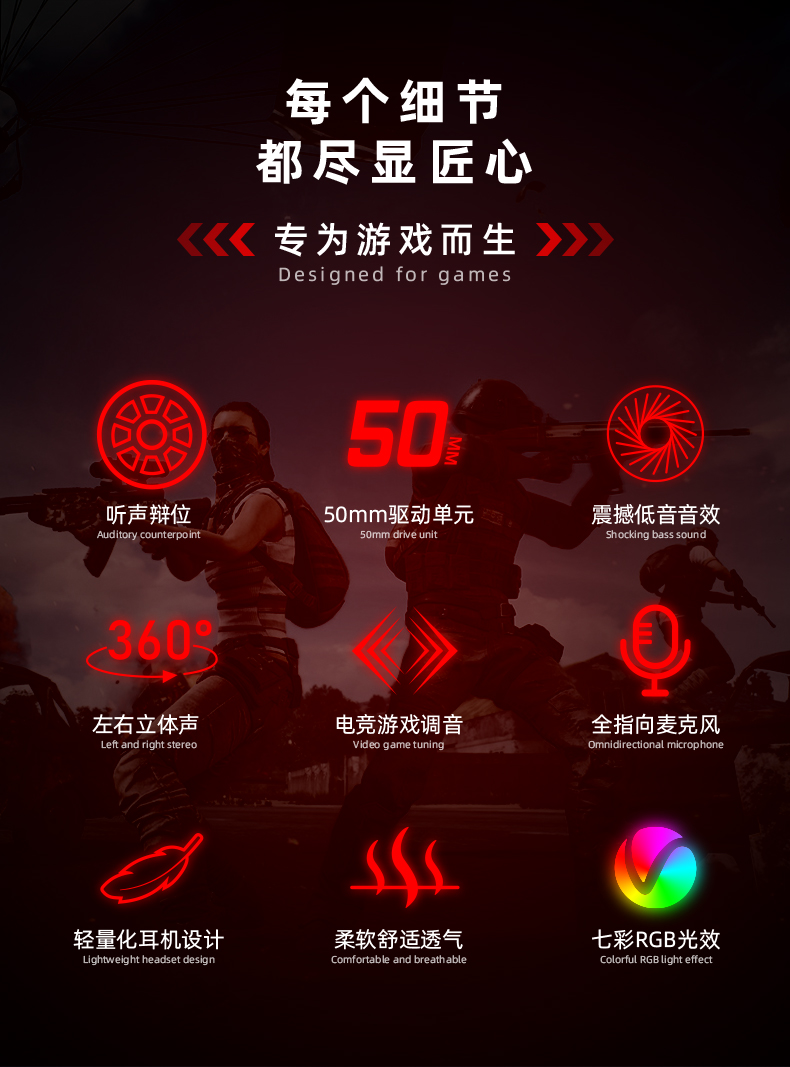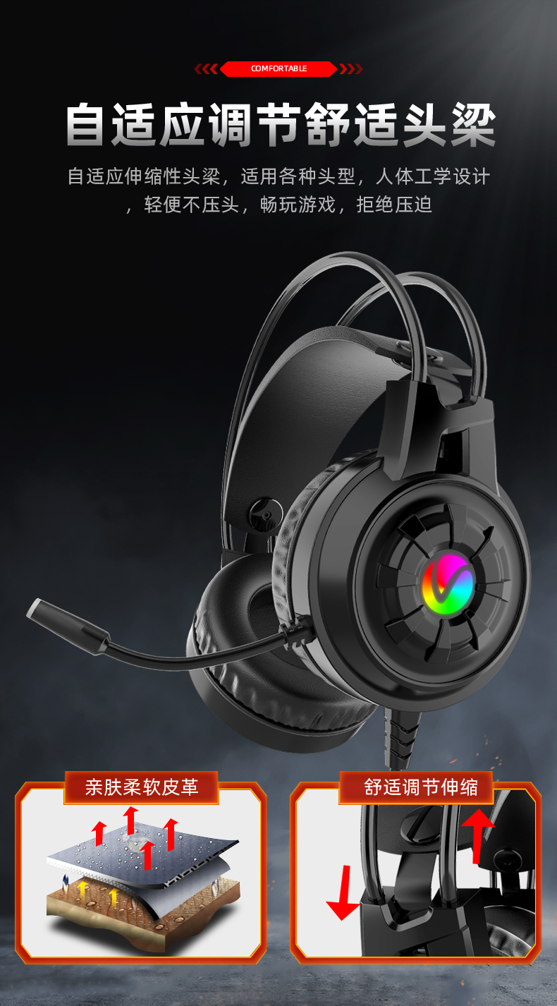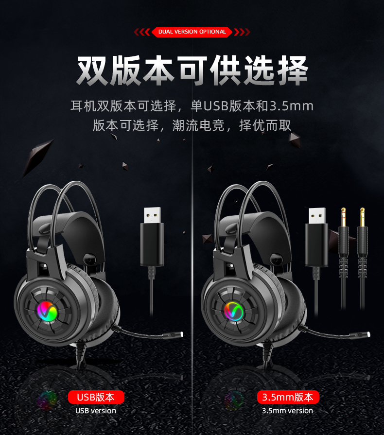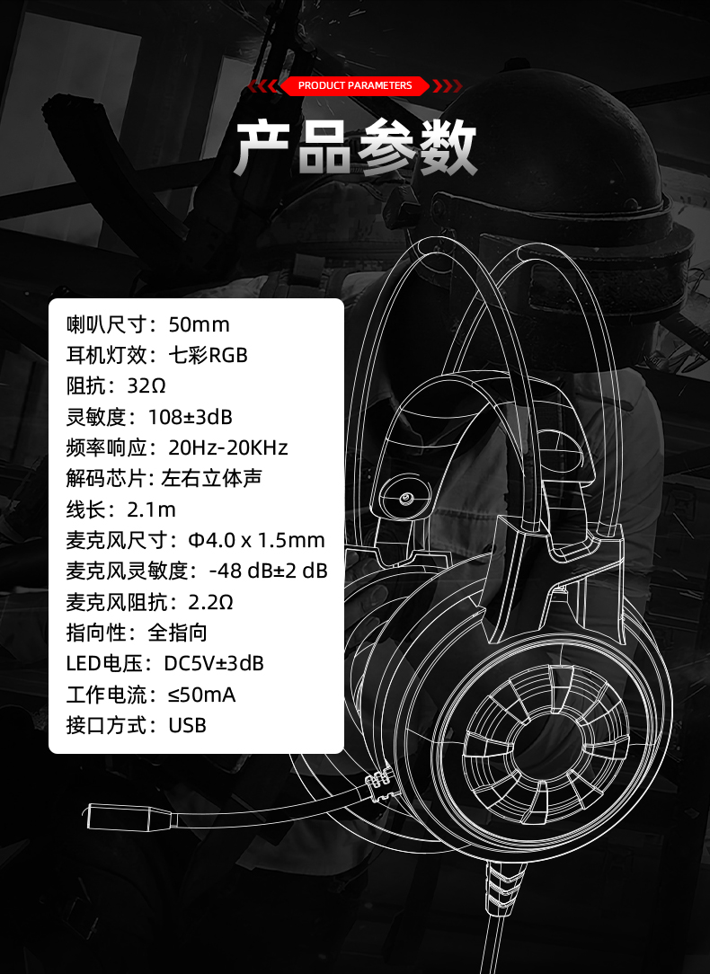 - USB连接,立体声,四声环绕,7.1声道,麦克风主动降噪,钛合金头梁